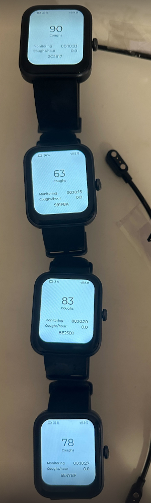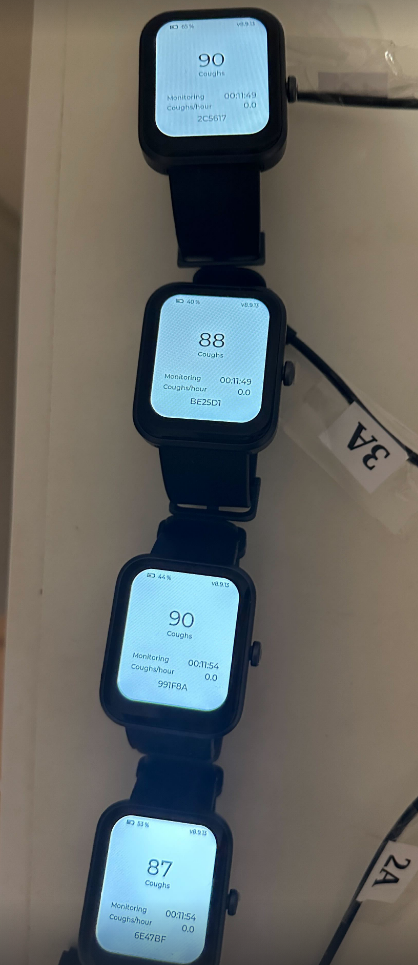 Cough detection capability was assessed via the playback of 100 coughs via controlled speaker. Following this exposure, all devices’ sensitivity remained within the range of expectations (ie, 85-90%) (see below image).