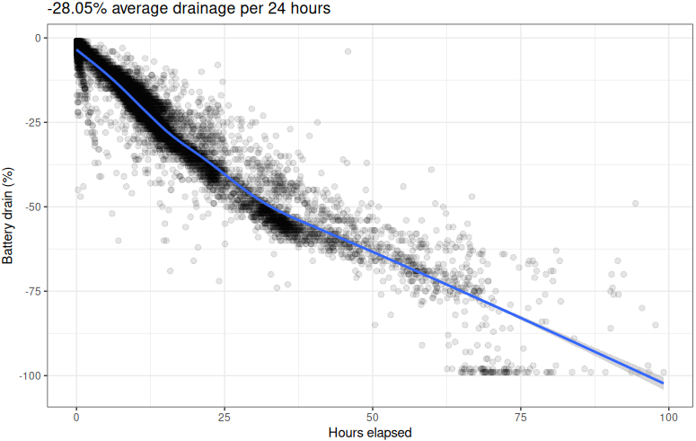 In these studies, it has been determined that the device drains at approximately a rate of 28% per 24 hours.
