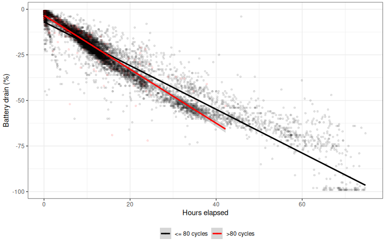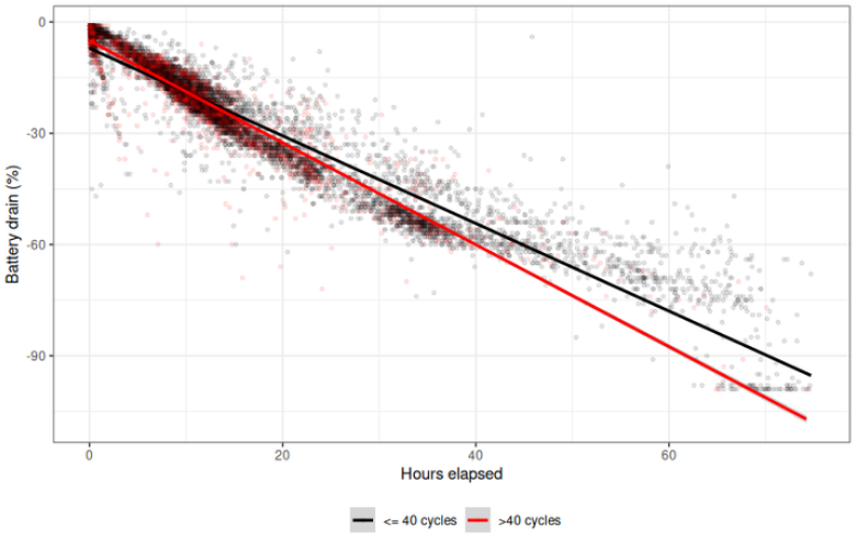 The same comparison was made between older (>80 cycles) and younger (<80 cycles) devices. Though the rate at which batteries drained was greater than at the >40 threshold, the effect is still minor, with the resultant cumulative time-to-empty still greater than the 3 days barrier.