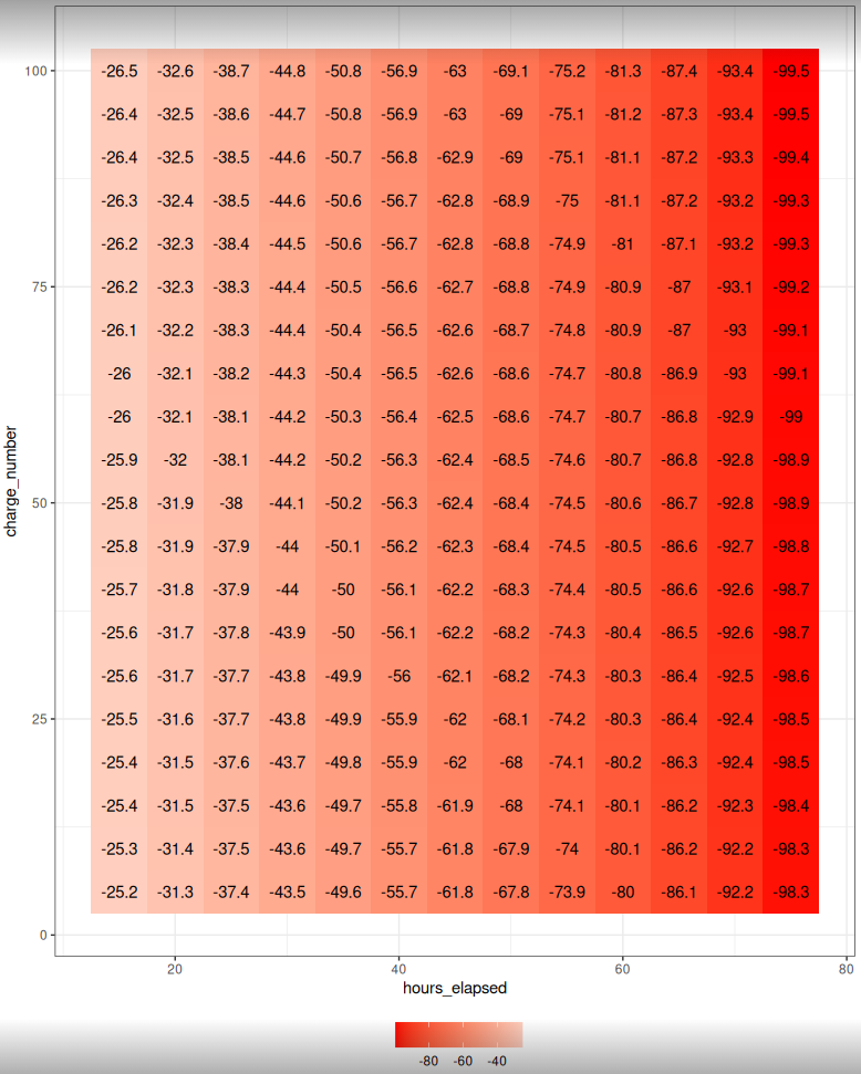 Used the empirical battery values observed in these RWE trials, a matrix of predictions was generated estimating battery drain as a function of hours elapsed since full charge (x-axis) and prior charges (y-axis). In all cases, up to 100 charges, the battery is expected to surpass the 3 days barrier (see below chart).
