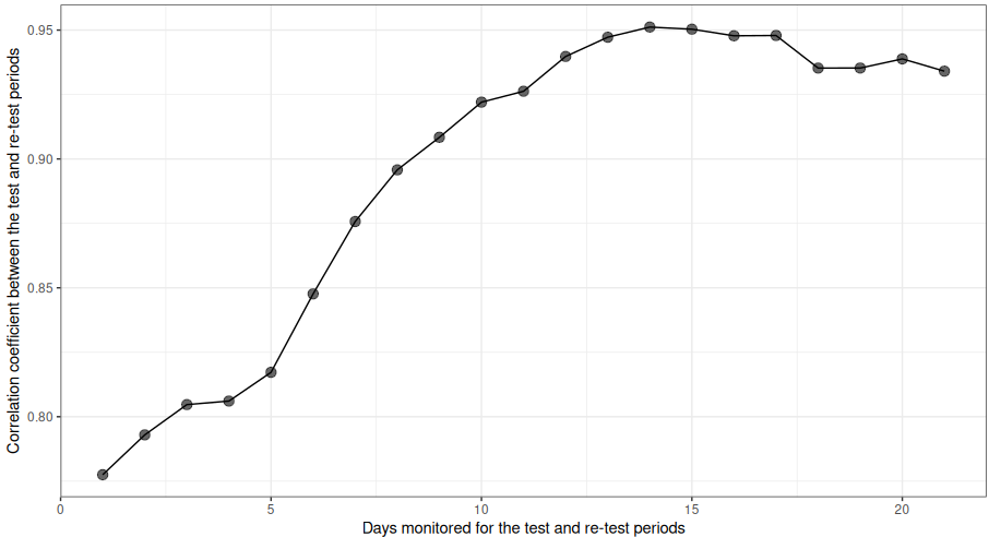 The below image shows test / re-test consistency (y-axis, correlation in cough rates between the two periods, as measured by the Pearson’s Correlation Coefficient) as a function of number of days of the test / re-test period (x-axis). This analysis was carried out in a population with no intervention (ie, expected clinical state = static).